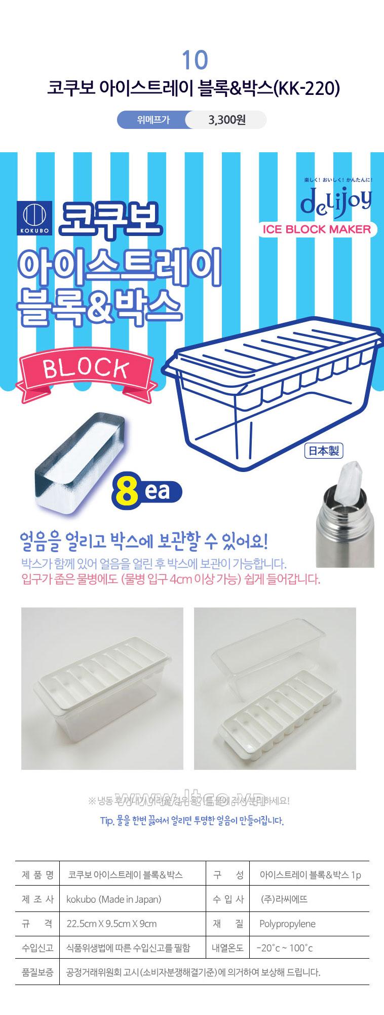 | Hướng dẫn sử dụng: | ● Vệ sinh sạch sẽ trước & sau khi dùng ○ Đổ đầy khay bằng nước cần đông lạnh, hoặc bột kem ○ Đặt vào phần trên của nắp, ấn mạnh bằng cả hai tay, nước thừa sẽ tự động tràn ra khỏi lỗ thông hơi. ○ Đặt khay vào trong ngăn đông của tủ lạnh từ 0 ~ 10 giờ. ○ Sau khi làm đá, mở tủ lạnh lấy khay ra, mở nắp trên và lấy từng viên đá theo nhu cầu sử dụng ○ Bảo quản nơi khô ráo, sạch sẽ ○ Tránh va đập mạnh ○ Tránh gần lửa hoặc những nơi có nguồn nhiệt cao! |