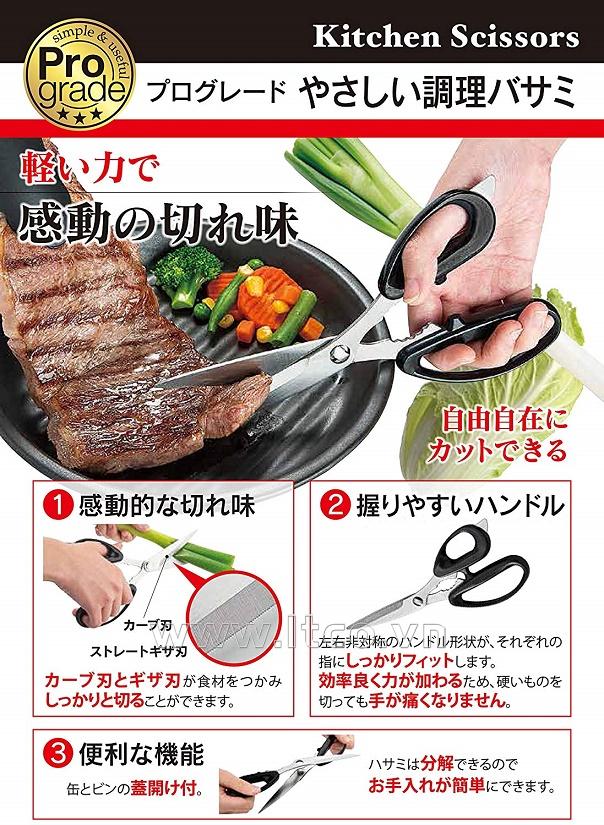 | ■ Tính năng bổ sung: ● Kéo cắt chuyên dụng cho nhà bếp gia đình, dòng sản phẩm nấu ăn đầy đủ, hạng chuyên nghiệp. ● Hình dáng tay cầm nhẹ và dễ cầm nắm. ● Dễ dàng làm sạch vì kéo có thể được tháo, tách dễ dàng. ● Có đầu mở nắp dạng lon tiện lợi. ● Lưỡi kéo cong kết hợp hình lưỡi răng cưa thẳng cho phép cắt thực phẩm mà không bị trơn trượt. ■ Sản phẩm được nhập khẩu trực tiếp từ Nhật Bản ■ Sản xuất tại Nhật Bản | MADE IN JAPAN |