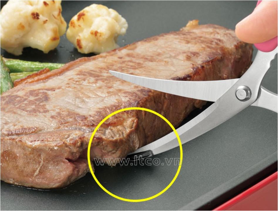 | Công dụng: | ● Dùng để cắt, tách & chế biến thực phẩm, thức ăn trong gia đình, nhà hàng ● Đầu lưỡi được uốn cong nên dễ dàng cắt, tách những thực phẩm như rau, củ mà không bị trơn trượt ● Đầu bịt bảo vệ đầu lưỡi giúp cho kéo không làm xước chảo rán |
