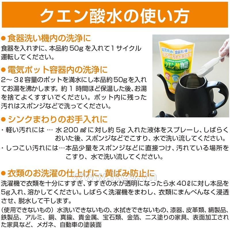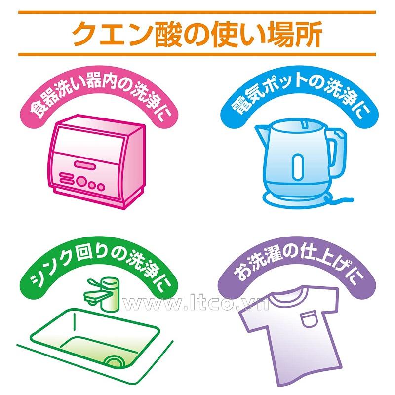| Hướng dẫn sử dụng: | ● Làm sạch lồng máy rửa bát: Cho 50g sản phẩm vào lồng máy rỗng và cho chạy máy như bình thường. ● Làm sạch ấm nước: Cho 2~3l nước hòa cũng 50g sản phẩm, đun sôi để nguội sau đó đổ dung dịch đi, rửa sạch lại bằng xà phòng và miếng rửa bát. ● Làm sạch bồn rửa bát: Đối với vết bẩn thông thường hòa 5g sản phẩm với 200ml nước, xịt lên bề mặt vết bẩn để trong 5 phút sau đó rửa sạch lại bằng nước, đối với vết bẩn cứng đầu: Cho trực tiếp sản phẩm lên miếng rửa và chà vết bẩn sau đó rửa sạch lại bằng |
