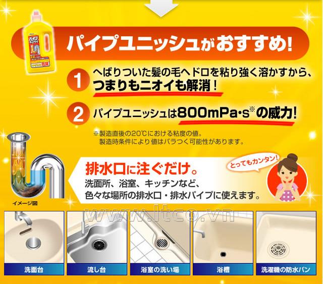 | Công dụng: | ○ Tiêu diệt tận gốc các loại vi khuẩn & chất cặn bẩn, mùi hôi thối. ○ Sử dụng cho đường ống ở trong phòng tắm, toilet & nhà bếp...vv ○ Loại bỏ bùn tắc, bùn ướt trong ống thoát nước ○ Không sử dụng với các đồ bằng men, nhôm, đồng |