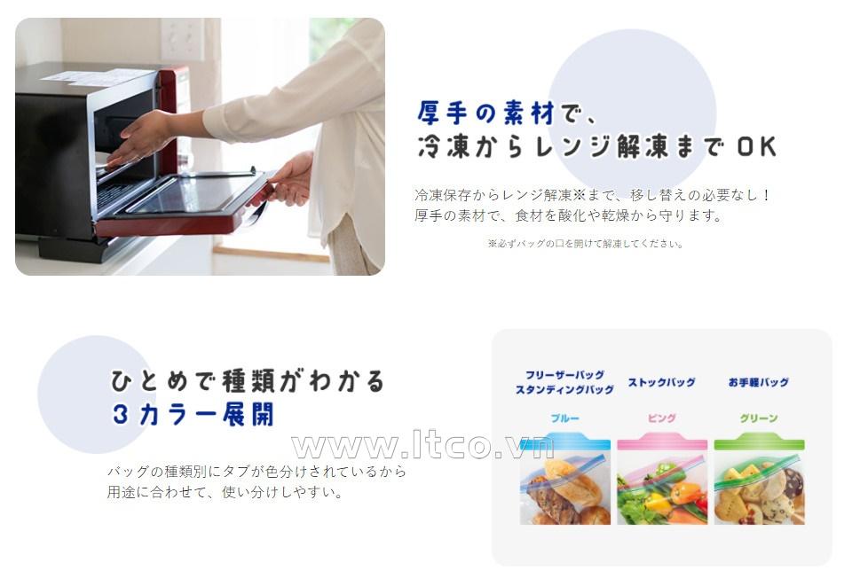 | Thông tin bổ sung: ○ Sản phẩm có thể tái sử dụng nhiều lần ○ Khi sử dụng để dã đông trong lò vi sóng, nên mở hé đầu khóa ra một khoảng nhất định sẽ giúp cho túi không bị vỡ/rách do áp lực hơi nước trong thực phẩm bốc ra trong quá trình rã đông ○ Sản phẩm được tuân thủ theo "tiêu chuẩn cho thực phẩm, phụ gia, v.v." được thiết lập dựa trên Luật Vệ sinh an toàn thực phẩm tại Nhật Bản. ● Sản phẩm được sản xuất tại Hoa Kỳ (USA) ; Nhập khẩu trực tiếp từ Nhật Bản |