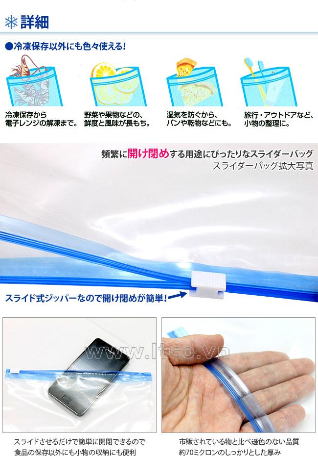| Công dụng: | ○ Dùng để chứa đựng & bảo quản thực phẩm hay các vật dụng cá nhân nhỏ gọn. ○ Miệng túi có khóa zip giúp dễ dàng đóng, mở tủi. ○ Sử dụng bảo quản thực phẩm trong tủ đông mà không lo ảnh hưởng đến chất lượng của thực phẩm. |