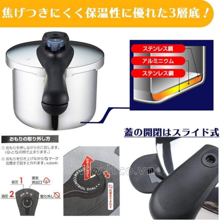 | ■ HƯỚNG DẪN BỔ SUNG KHI SỬ DỤNG: ○ Một tay giữ tay cầm dài, tay còn lại nắm tay cầm phía trên và xoay nắp ngược chiều kim đồng hồ sau đó nhấc nắp lên. ○ Cho nước và thực phẩm vào. ○ Lưu ý rằng lượng nước và thực phẩm không nên ít hơn 1/5 hoặc vượt quá 4/5 chiều cao của lòng nồi. Thực phẩm khi đun nấu không được nở cao quá 3/5 chiều cao của lòng nồi. ○ Đặt nắp nồi lên thân nồi sao cho 2 mũi tên trên nắp nồi và tay cầm đối thẳng nhau, xoay tay cầm của nắp theo chiều kim đồng hồ đến khi nghe âm thanh “cạch” thì nắp nồi được khoá lại. ○ Lưu ý: Khi muốn mở nắp, phải đảm bảo rằng áp suất trong nồi không còn bị đẩy ra qua van hơi. Không nên cố dùng lực cưỡng ép để mở nắp khi vẫn còn hơi xì ra từ van hơi, có thể gây nguy hiểm cho người sử dụng. ❉ Sản phẩm được sản xuất bởi: Công ty Pearl Metal Co.,Ltd (Japan) ❉ Add: No.190 Gomyo, Sanjo City, Niigata Prefecture, 955-8588, Japan ❈ Sản phẩm được nhập khẩu trực tiếp từ Nhật Bản ❈ Sản xuất tại Trung Quốc |