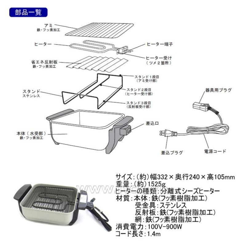 | Chất liệu/Thành phần: | ● Thân bằng hợp kim thép qua xử lý fluororesin bền bỉ & an toàn ● Chân đế bằng thép không gỉ ● Tấm phản xạ nhiệt bằng thép qua xử lý fluororesin ● Lưới bằng thép qua xử lý fluororesin |